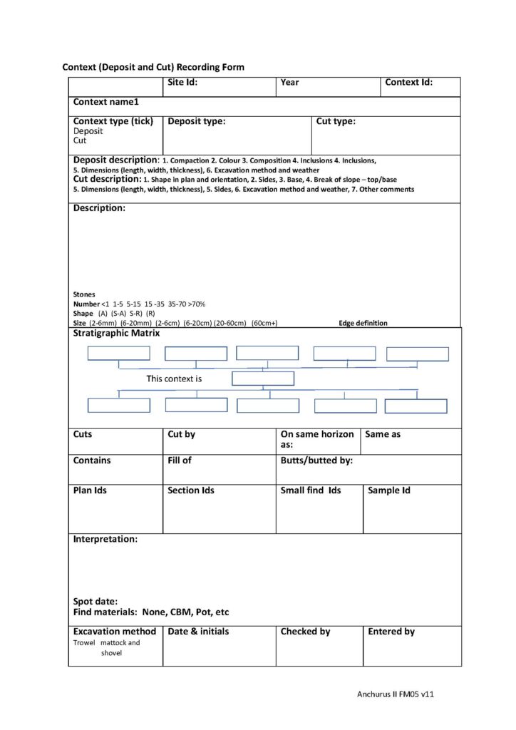 As you excavate a site, so you identify and record many contexts and record them on context forms. Each context has a context identifier which is allocated when the context is identified and remains unchanged while the context is excavated and throughout post excavation.