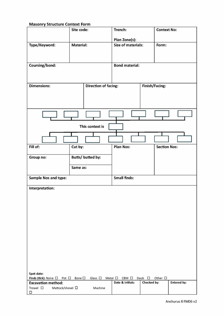 You use this form to record masonry structures. This is a context form so you use it to record one and only one context. For the structure, typically a wall, you record the materials it is made of, the courses of material, the bonding materials, the stratigraphic relationships between this context those around it, sketches of sections and plans and workflow information.