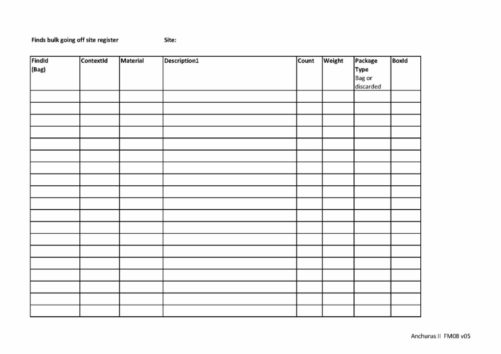 Anchurus II supports a “bulk going off site” find register that you use to record finds you take off site so that you know that all the finds that left the site have arrived in post excavation. Once finds arrive in post excavation so the real work of registering and re cording finds can begin.