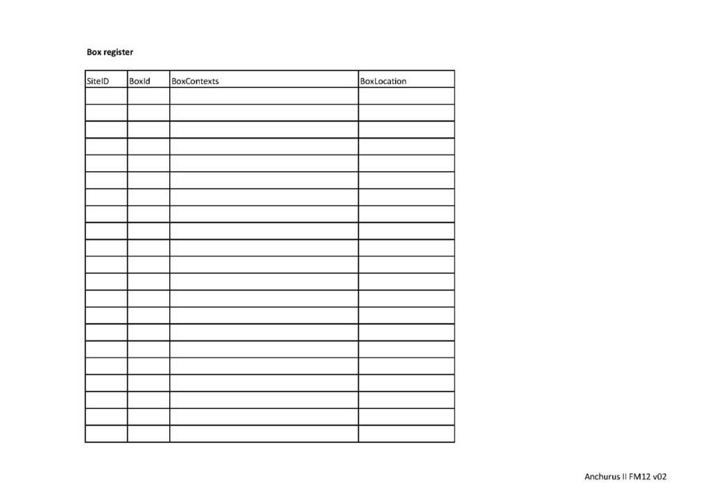 Within Anchurus II boxes are treated so a site has a dedicated set of boxes dedicated to its finds. The box register template is shown above.